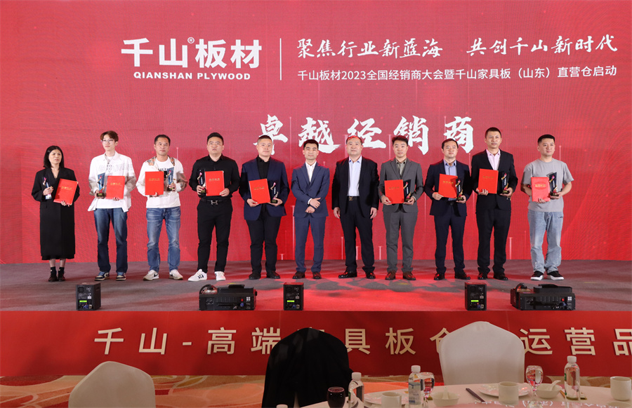 大會總結回顧了千山近年來的突破發展,強調了品牌升級和家具板倉儲兩項發展目標,重點解讀了千山家具板直營倉的發展,并隆重表彰了堅韌逐夢、業績出眾的經銷商大咖,實力開啟千山發展新征程!