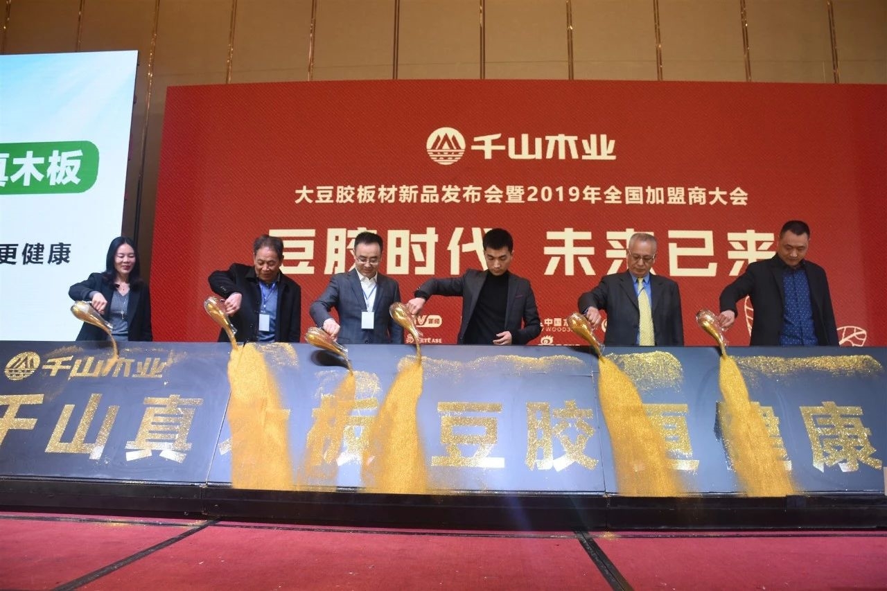 2019年3月21日,在板材之都山東臨沂舉行了“豆膠時(shí)代·未來已來”新品發(fā)布會(huì)暨2019年全國加盟商大會(huì)。千山大豆膠板材成功上市,意味著板材行業(yè)由脲醛膠E0級時(shí)代跨入植物豆膠新時(shí)代!