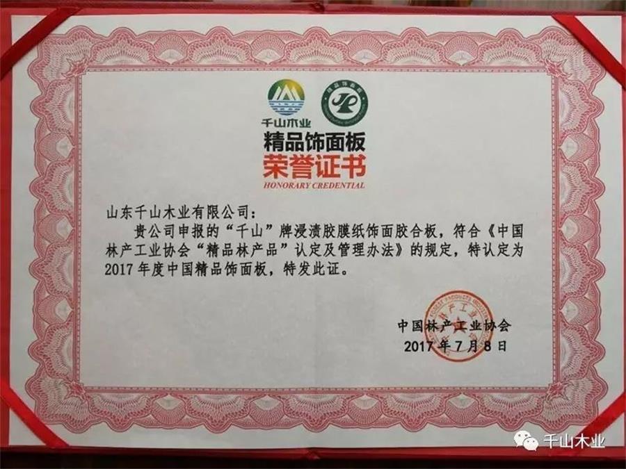 2017年7月,中國木質(zhì)林產(chǎn)品質(zhì)量提升與品牌建設(shè)高峰論壇在廣州舉行,千山應(yīng)邀參加,并榮獲2017年度“精品人造板(含飾面板)”、“精品裝飾紙”榮譽(yù)。