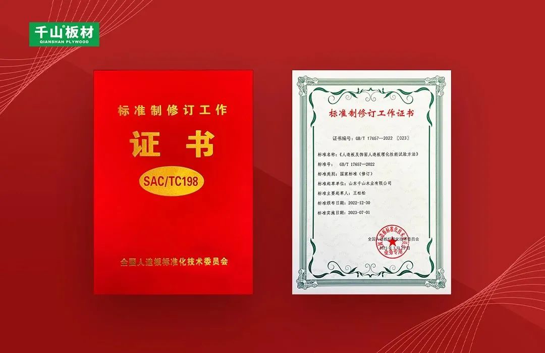 2023年3月,由全國人造板標(biāo)準(zhǔn)化技術(shù)委員會(huì)、中國林業(yè)科學(xué)研究院木材工業(yè)研究所、林業(yè)產(chǎn)業(yè)標(biāo)準(zhǔn)化國家創(chuàng)新聯(lián)盟主辦的《人造板及飾面人造板理化性能試驗(yàn)方法》等新頒布標(biāo)準(zhǔn)宣貫培訓(xùn)暨產(chǎn)業(yè)發(fā)展研討會(huì)在浙江南潯召開,千山應(yīng)邀出席并獲頒國家標(biāo)準(zhǔn)制修訂工作證書。