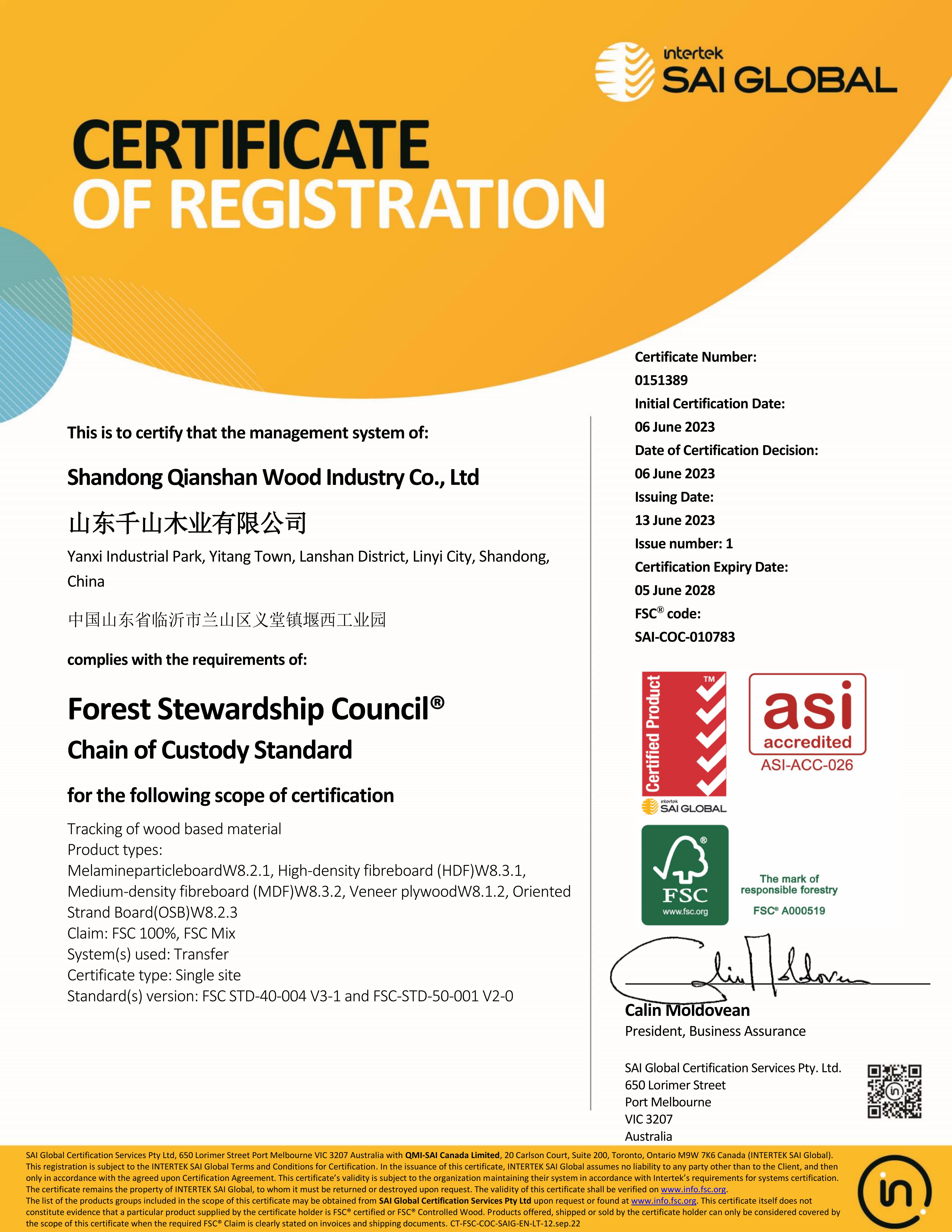 2019年,千山無醛級大豆膠板材成功上市,引領板材行業進入植物豆膠新時代通過了國內最高級別的環保產品認證——中國環境標志產品認證(十環認證),并獲得中國綠色產品認證證書、環境管理體系認證證書、質量管理體系認證證書;2023年千山再次順利通過“全球最嚴苛的”森林認證——FSC森林認證
