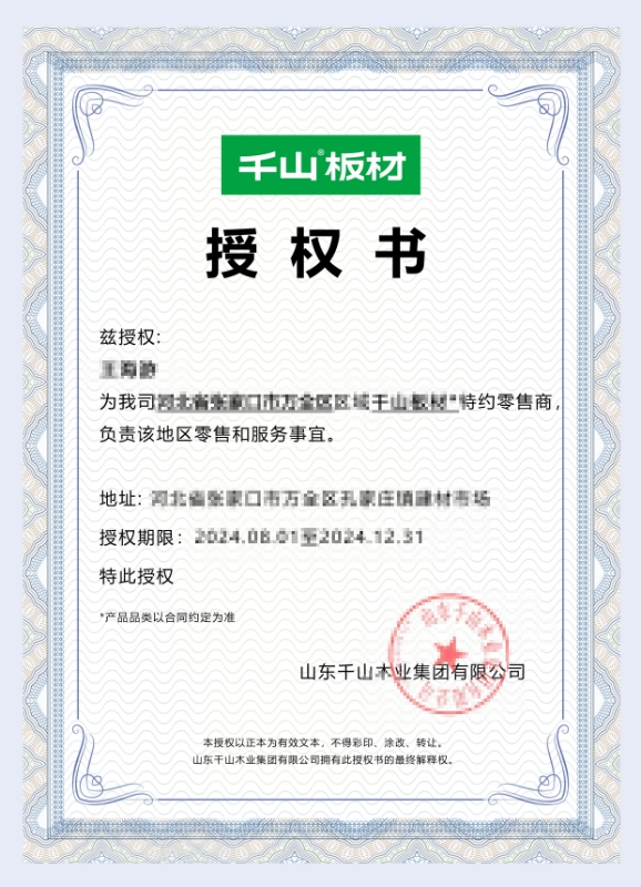 為了廣大消費(fèi)者的切身權(quán)益和消費(fèi)體驗(yàn),購(gòu)買(mǎi)產(chǎn)品時(shí),應(yīng)選擇千山板材授權(quán)的銷(xiāo)售渠道,可查看經(jīng)銷(xiāo)商授權(quán)證明文件。