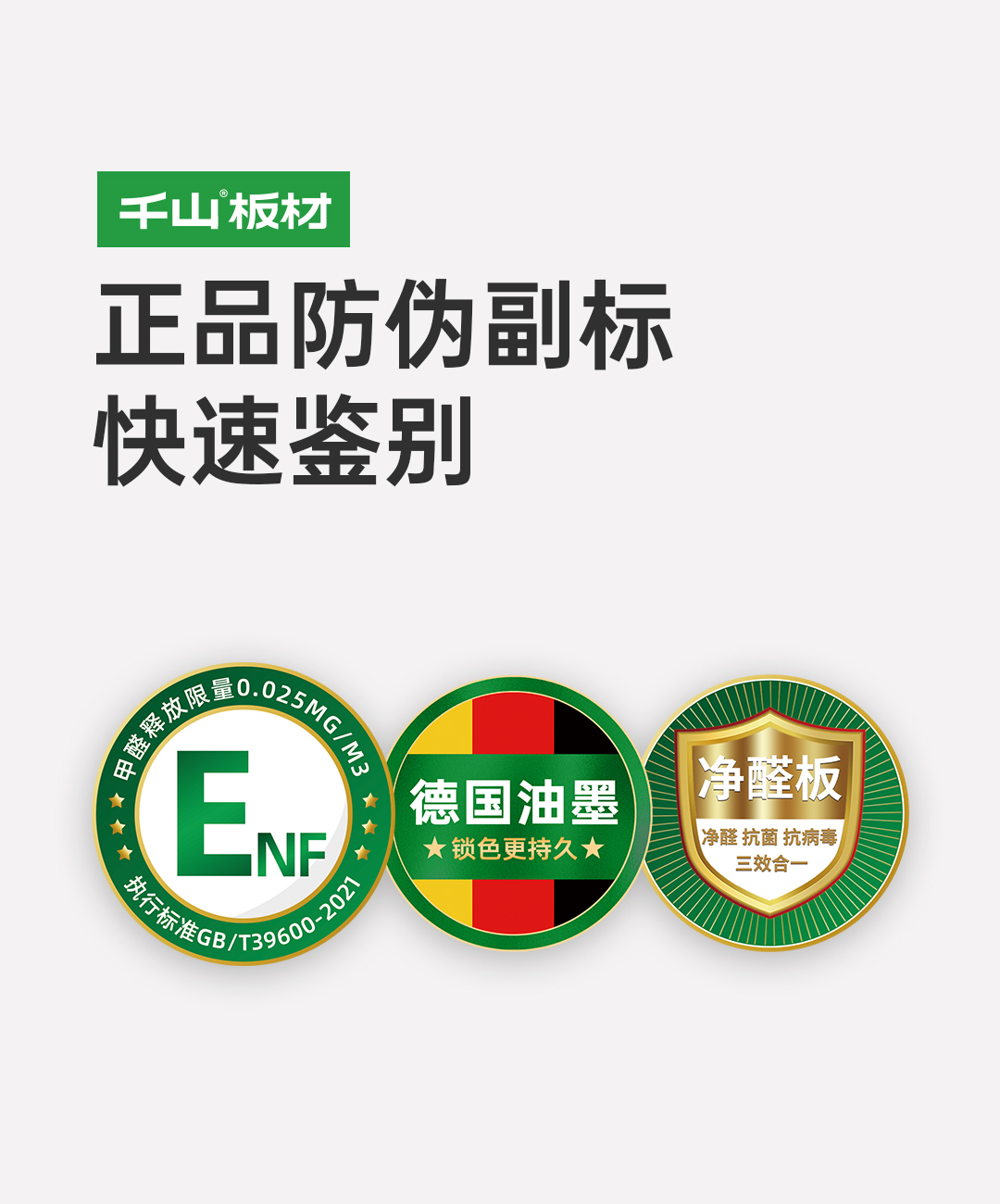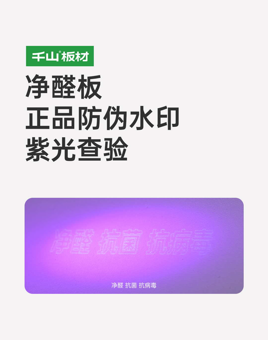 正品千山板材表面都印有隱形防偽標(biāo)識(shí),使用紫光手電筒照射板材表面,顯現(xiàn)“千山板材” 或 “千山板材ENF”水印,凈醛板顯現(xiàn)“凈醛 抗菌 抗病毒”水印。