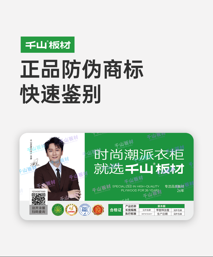 正品千山板材均有可鑒別、可查詢的防偽商標(biāo)及防偽編碼,刮開(kāi)二維碼涂層,微信掃描二維碼,即可查詢驗(yàn)證。同時(shí),防偽商標(biāo)表面測(cè)光可見(jiàn)“千山板材”亮色水印。