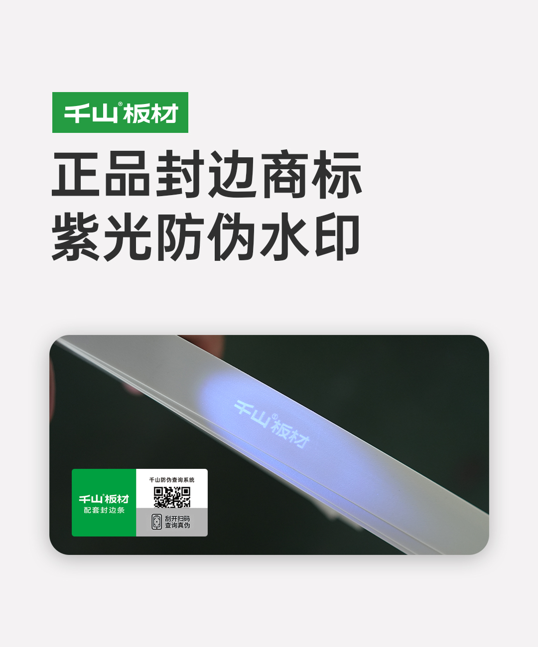 正品配套封邊皮有千山板材防偽商標(biāo),刮開(kāi)圖層后可掃碼查詢真?zhèn)危?/span>用紫光照射查驗(yàn),顯示“千山板材”防偽水印。