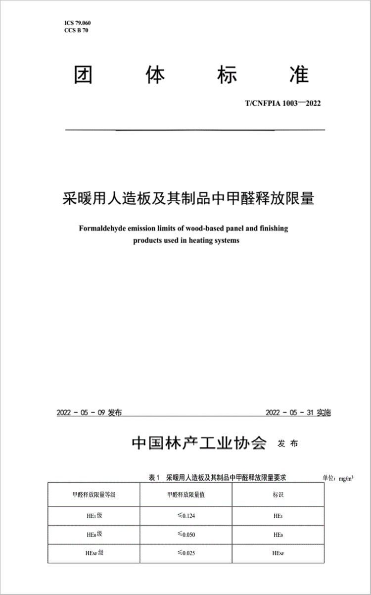 2022年5月31日開始實施的T/CNFPIA1003—2022《采暖用人造板及其制品中甲醛釋放限量》文件,對甲醛釋放量有三個分級,分別為HE1(≤0.124mg/m3)、HE0(≤0.050mg/m3)、HENF(≤0.025mg/m3)。