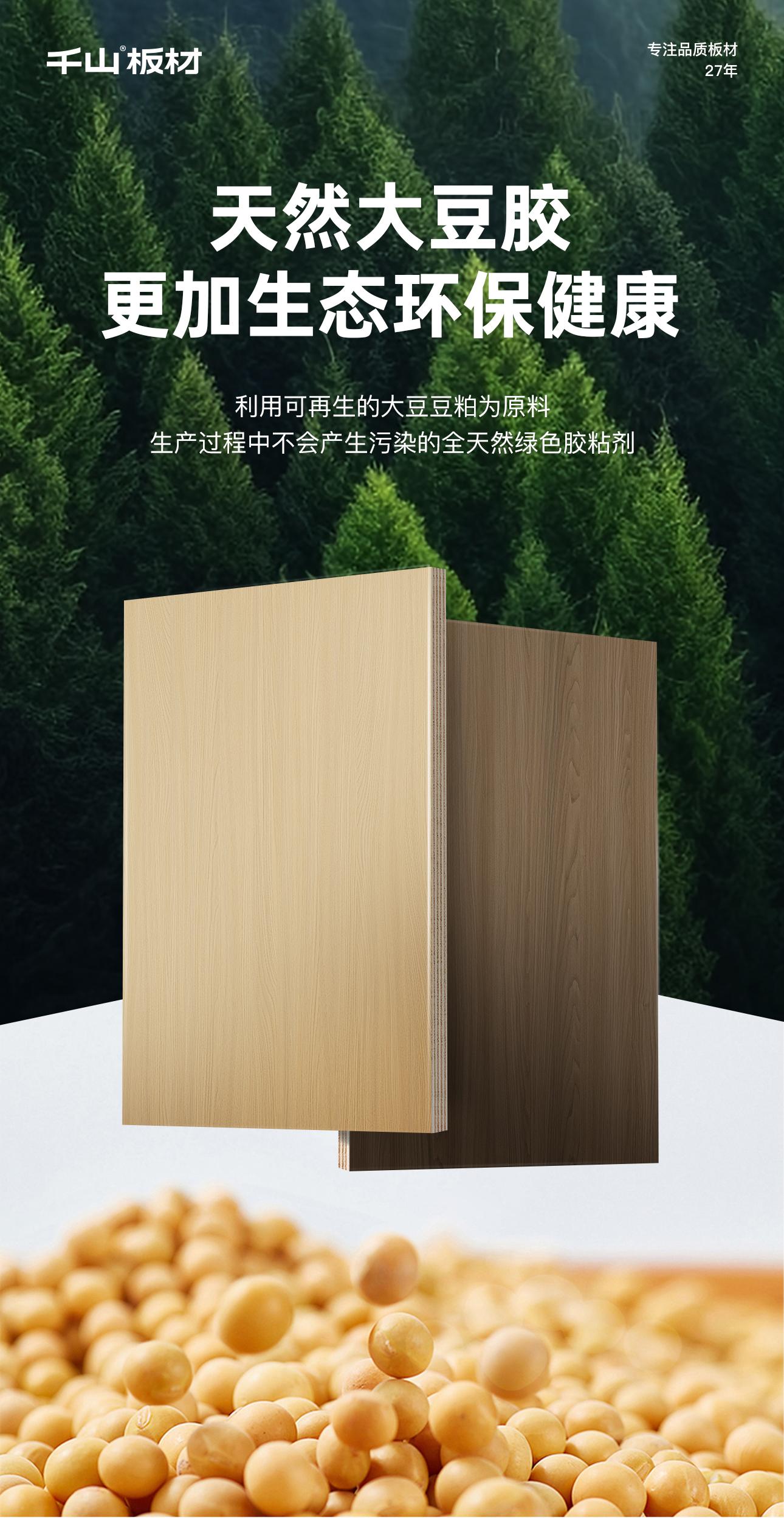 自2019年成功上市以來,千山大豆膠板材以無醛大豆膠黏劑技術、優質實木板芯以及無醛添加制造工藝,在無醛人造板市場脫穎而出。憑借卓越的產品品質與環保性能,連續六年暢銷,成為消費者信賴的明星產品。