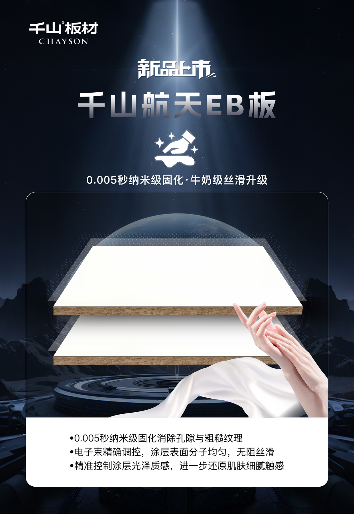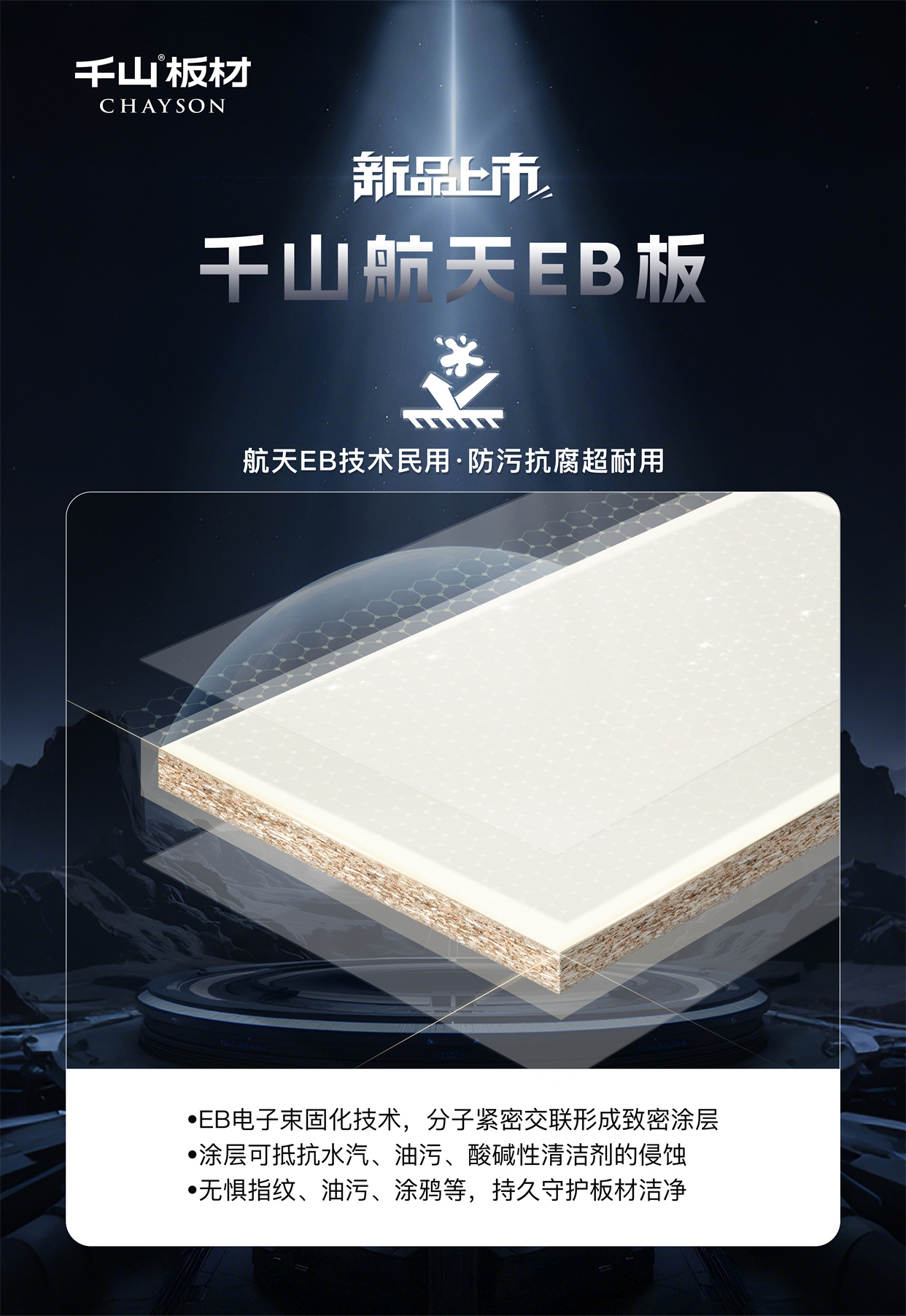 千山航天EB板:耐污一擦凈,十年不黃變!讓黑科技點亮家的奢顏,用高能品質守護健康空間,歡迎當地專賣店鑒賞咨詢。